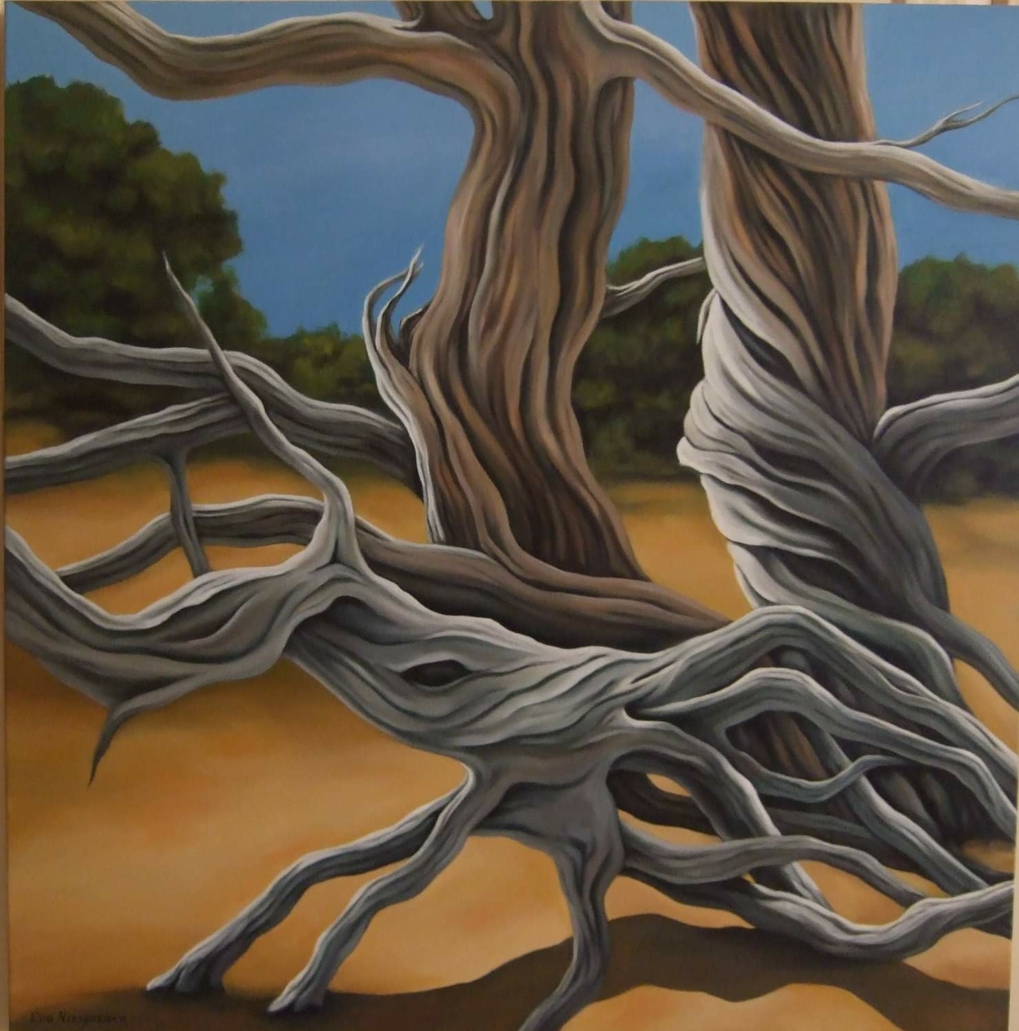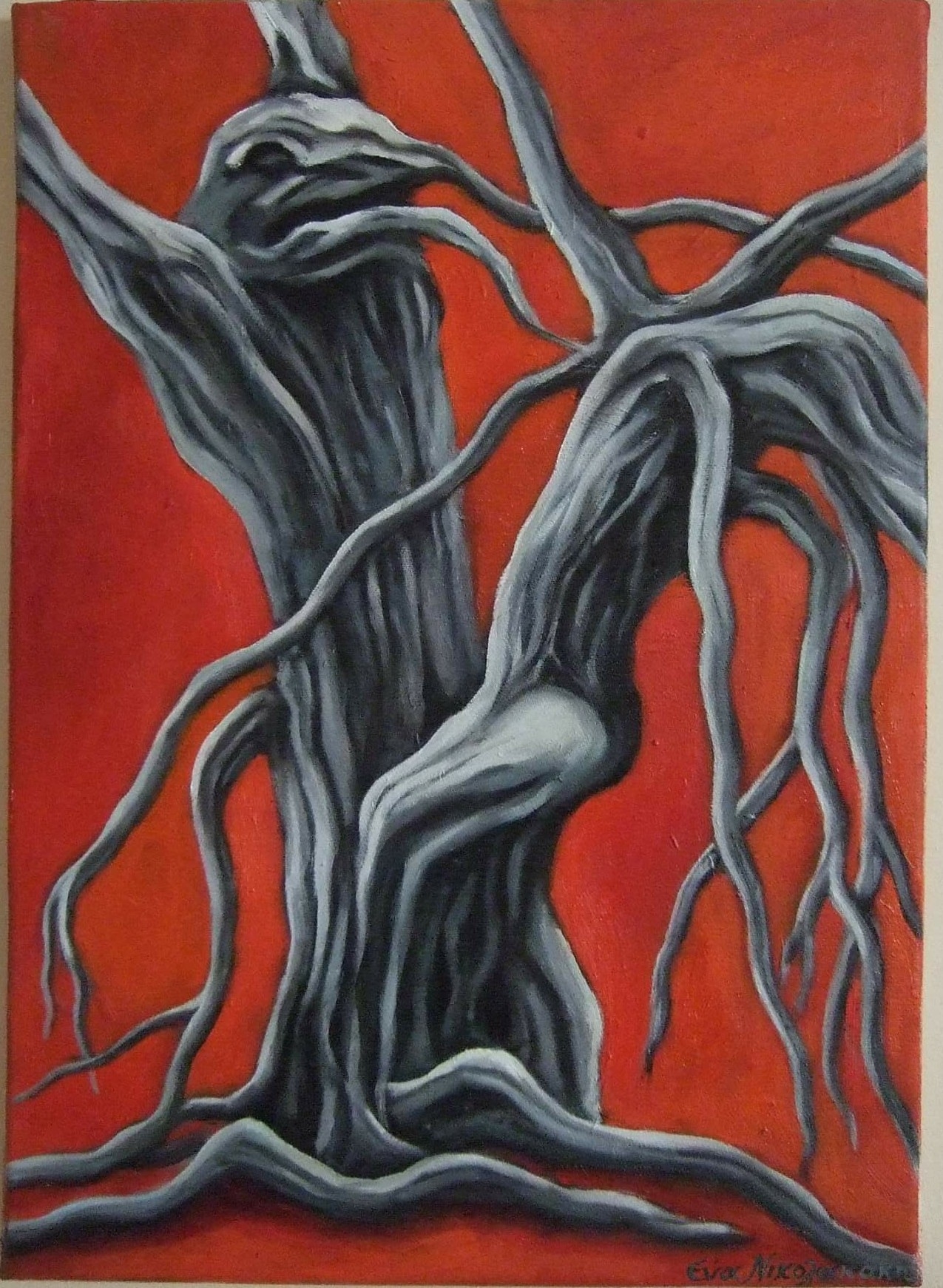 Ανθρώπινα κορμιά, που αποπνέουν ρεαλιστικό αέρα, προσφέρουν ένα ζεστό άγγιγμα αισθήσεων απουσιάζοντας κάθε πρόθεση πρόκλησης, από τον χρωστήρα της δημιουργού. Κορμοί δέντρων, απογυμνωμένοι, ερωτοτροπούν μέσα από τους ιριδισμούς του φυσικού τους χώρου, κάνοντας ζωηρά παιγνίδια με το φυσικό τους περιβάλλον. Αναζήτηση ίσως της τρίτης διάστασης, με χρώματα λαδιού και πάστες δουλεμένα με πινέλα και σπάτουλες πάνω στον καμβά, δείνουν απλόχερα ακόμη και στον μη εκπαιδευμένο φιλότεχνο, ερεθίσματα και εικόνες μιας διαφορετικής πραγματικότητας.