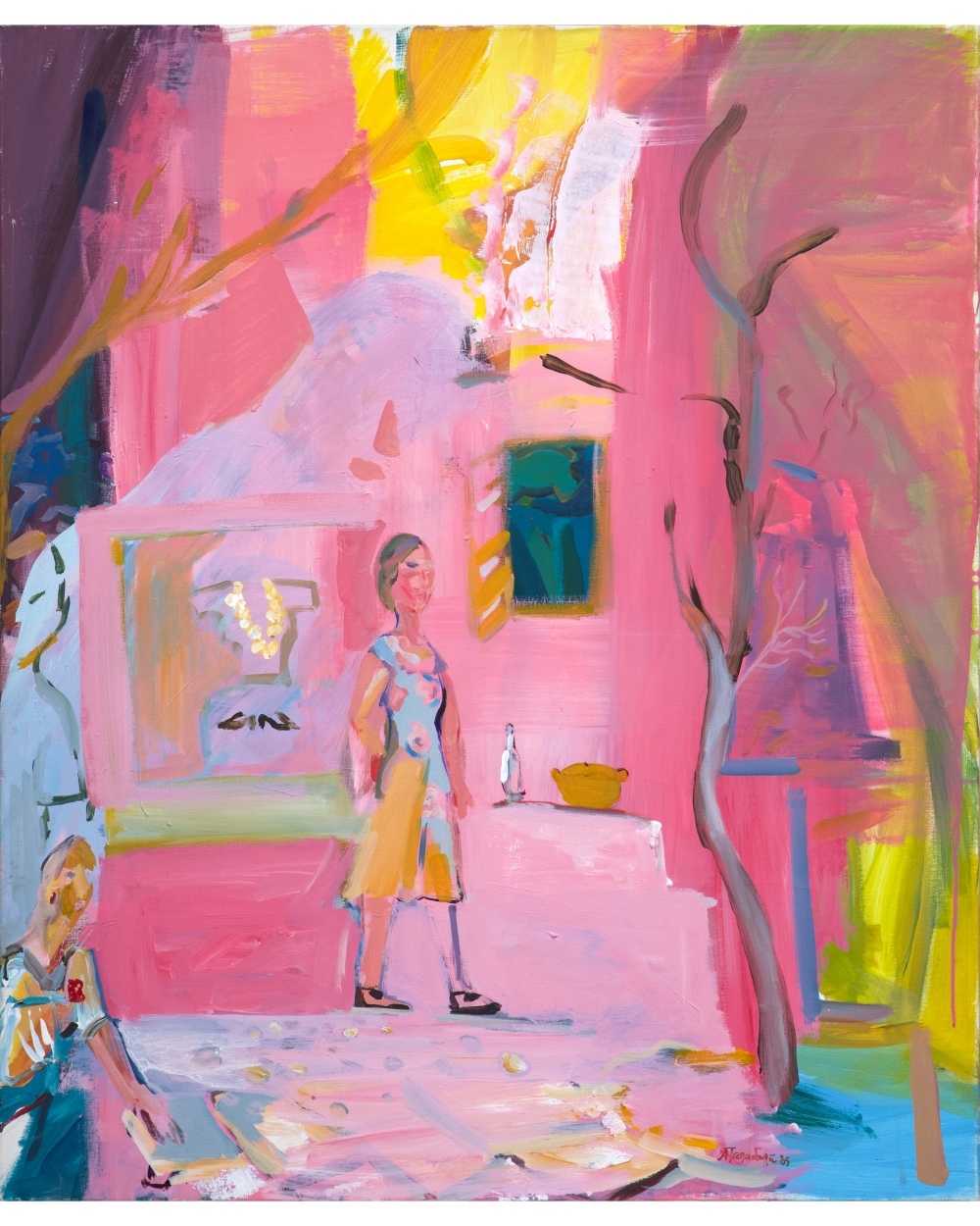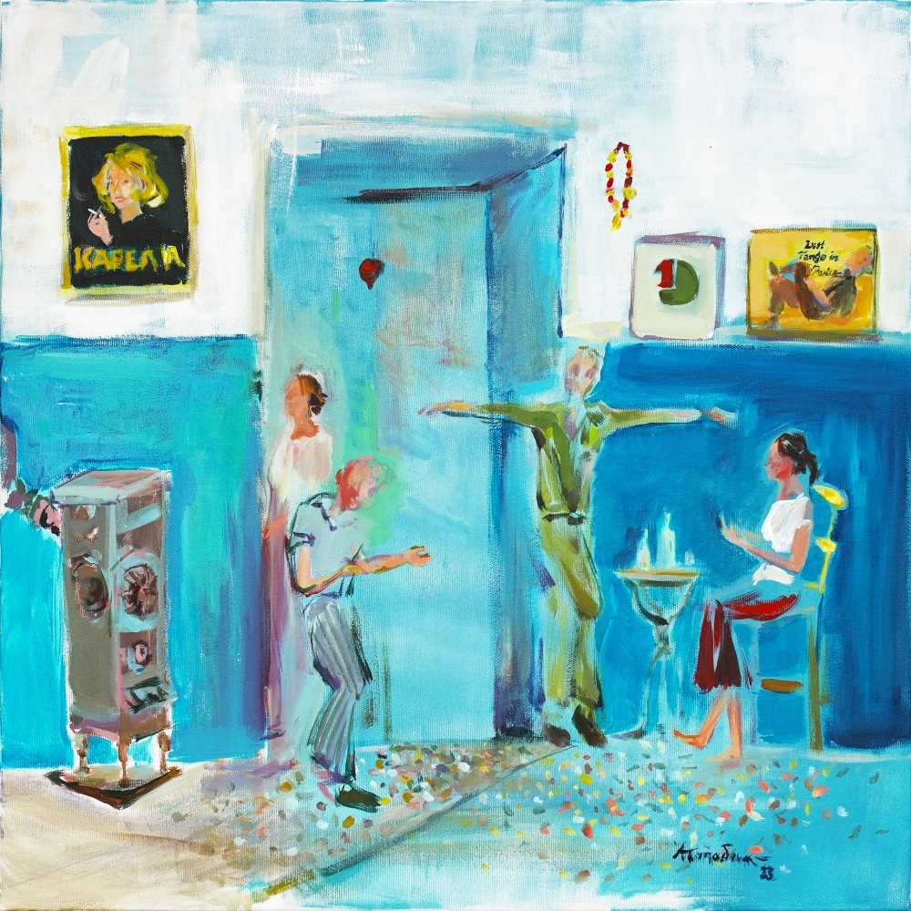 -Η ανάγκη που με οδήγησε να δουλέψω συστηματικά για αυτήν την ενότητα ήταν η ανάγκη για την συνεύρεση με τον κόσμο μετά την καραντίνα. Σε αρκετά από αυτά τα έργα, λοιπόν, ενώ υπάρχει εσωτερικά αυτή η ανάγκη, θα δει κανείς φιγούρες μόνες τους ή σε σχεδόν άδεια μπαρ να πίνουν. Η ανάγκη για εξωστρέφεια συγκρούεται με τον φόβο της πανδημίας. Όπως στα έργα «I’ll be seeing you» και «στο Τραλαλά» βλέπει κανείς αυτήν την αντίφαση. Στο έργο «The party» είχα κορωνοϊό και δεν μπορούσα να κάνω τίποτε άλλο παρά να ζωγραφίζω. Παρότι όμως είχα πυρετό και αρκετή ταλαιπωρία έβαλα τραγούδια των Beatles κι έφτιαξα ένα φανταστικό πάρτι με φιγούρες, στην πραγματικότητα φιλικά πρόσωπα κι εμένα, που χορεύαμε σε φόντο με γραμματοσειρά που παραπέμπει σε Beatles. Στο έργο «Η αυλή» με έχει απασχολήσει η διαμόρφωση του φόντου: ταβάνι και πάτωμα έχουν κυκλικές πινελιές που με οδήγησαν να φτιάξω τις χαρακιές ενός βινυλίου κάτω στο πάτωμα όπου περιστρέφεται, όσο λικνίζεται μια γυναίκα.