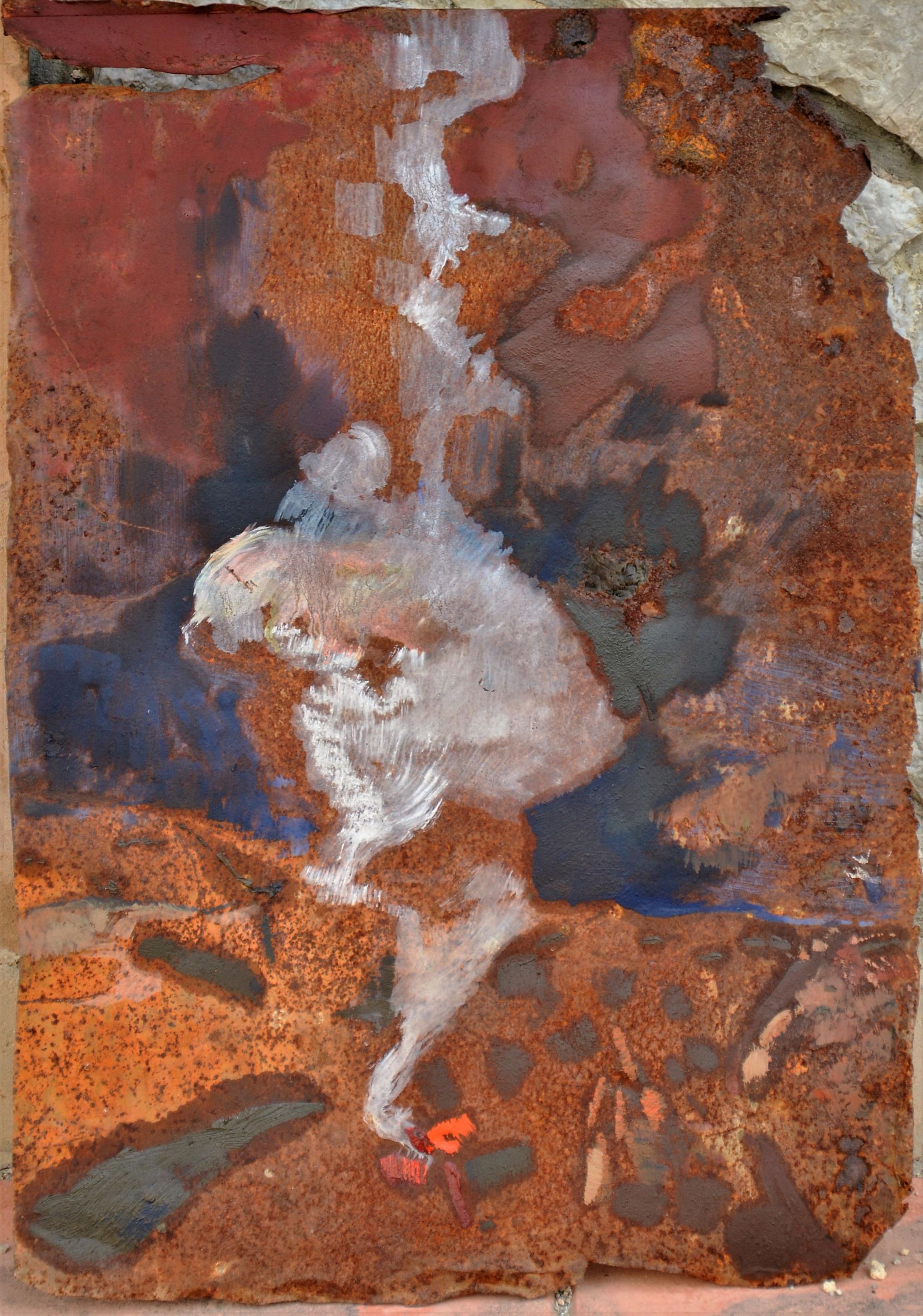 Η ζωγραφική με ακρυλικά ή λάδια σε ‘χορταστικές’ επιφάνειες είναι μια σταθερή πρακτική..Όλο εκεί γυρνάω. Κατά καιρούς έχω πειραματιστεί με την ύλη όπως σκουριά, ξύλο, ύφασμα και έχω αξιοποιήσει για το έργο μου ευρήματα (found objects) όπως παλιές πόρτες, σκαριά βάρκας και σκουριασμένες λαμαρίνες. Ειδικά στη σκουριά έχω μια αδυναμία.