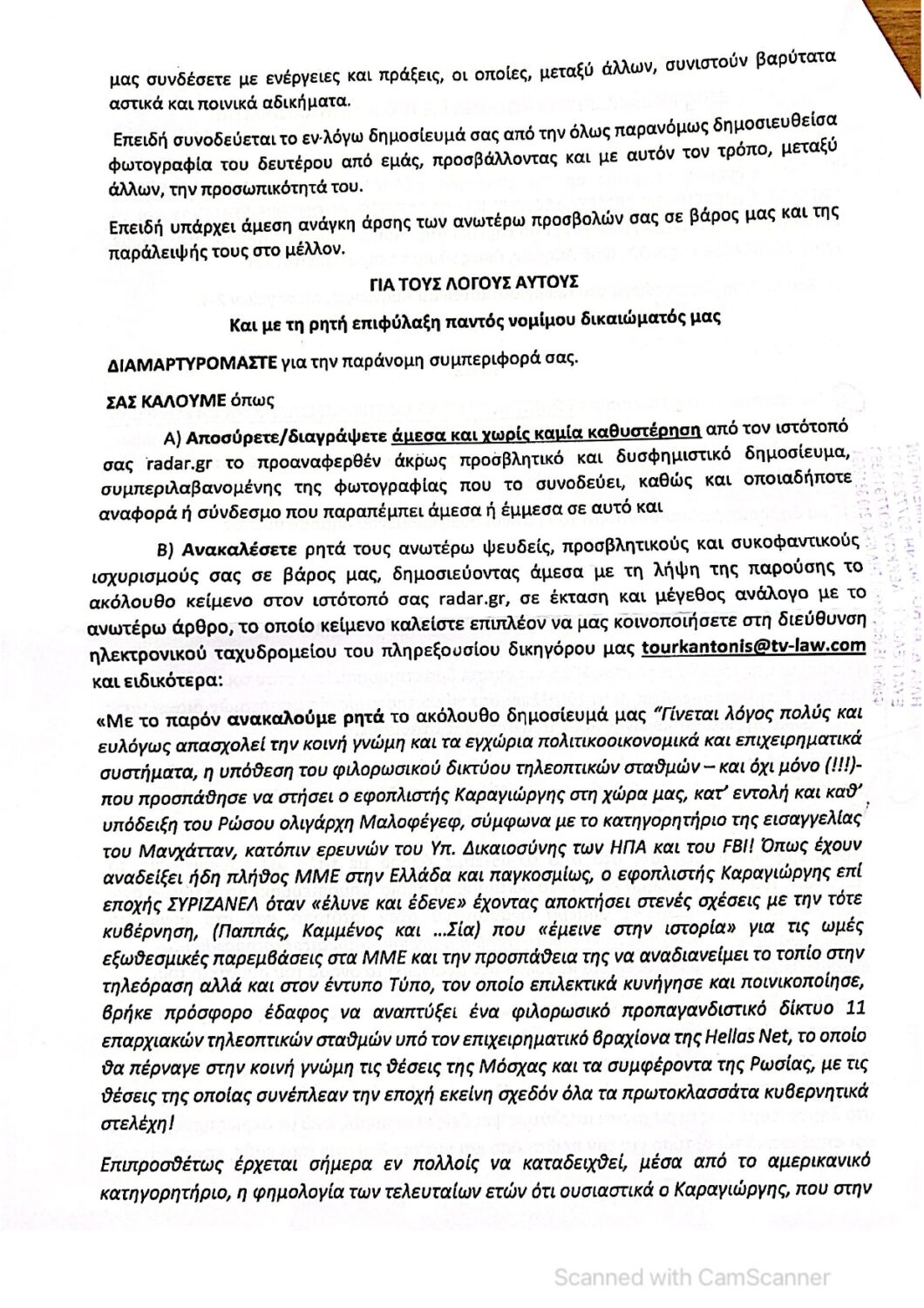 1. Λάβαμε στο Radar.gr ένα εξώδικο από τον πρώην μικροεφοπλιστή και νυν συνταξιούχο Καραγιώργη, περιφερειακό καναλάρχη και κουμπάρο του Ρώσου ολιγάρχη Μαλοφέγιεφ, τους οποίους FBI και Αμερικανικές αρχές, μέσω της εισαγγελίας του Μανχάταν κατηγορούν για δημιουργία δικτύου φιλορωσικής προπαγάνδας και στην Ελλάδα, διά του οποίου μας καλεί να ανακαλέσουμε πρόσφατο δημοσίευμα για διακίνηση εκτός των άλλων και ιρανικού πετρελαίου, καθώς και για την εκ νέου προσπάθεια που κατέβαλε μέσω «θεατρανθρώπου» να διεισδύσει σε εφημερίδες και τηλεοπτικούς σταθμούς ενόψει της εισβολής Πούτιν στην Ουκρανία!