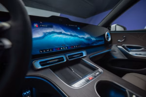 Στο εσωτερικό, η νέα C-Class υιοθετεί την πιο εξελιγμένη εκδοχή του MBUX, με τεράστια ενιαία οθόνη που καλύπτει σχεδόν ολόκληρο το ταμπλό. Το σύστημα ενσωματώνει δυνατότητες τεχνητής νοημοσύνης και εξελιγμένης συνδεσιμότητας, προσφέροντας εμπειρία που θυμίζει περισσότερο σύγχρονη ψηφιακή συσκευή παρά παραδοσιακό αυτοκίνητο. Η ατμόσφαιρα ενισχύεται από ambient φωτισμό νέας γενιάς και premium υλικά, ενώ η συνολική σχεδίαση ακολουθεί πιο minimal φιλοσοφία.