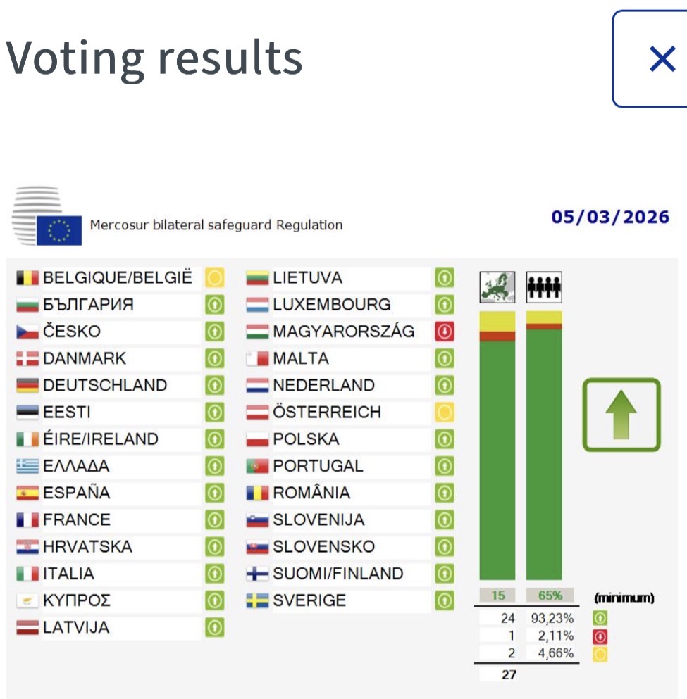 Το Ευρωπαϊκό Κοινοβούλιο ενέκρινε τον Κανονισμό στις 10 Φεβρουαρίου 2026 με 483 ψήφους υπέρ, ενισχύοντας την προστασία για ευαίσθητους κλάδους όπως το κρέας και τα πουλερικά. Η Κύπρος υποστήριξε τη συμφωνία, βλέποντας οφέλη για εξαγωγές όπως πρώτες ύλες ζωοτροφών και προστατευόμενα προϊόντα.