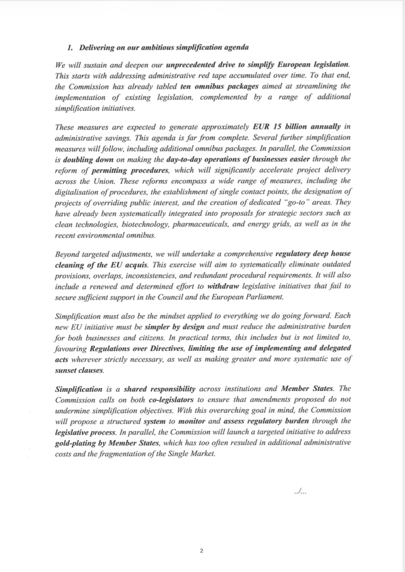 Στο πρώτο σκέλος της επιστολής, η πρόεδρος της Κομισιόν παρουσιάζει μια φιλόδοξη «ατζέντα απλοποίησης» της ευρωπαϊκής νομοθεσίας, την οποία χαρακτηρίζει «άνευ προηγουμένου». Η Επιτροπή έχει ήδη καταθέσει δέκα νομοθετικά «omnibus» πακέτα για τον περιορισμό της γραφειοκρατίας και τον εξορθολογισμό της εφαρμογής υφιστάμενων κανόνων, με εκτιμώμενη ετήσια εξοικονόμηση περίπου € 15 δισ. σε διοικητικό κόστος για επιχειρήσεις και διοικήσεις.