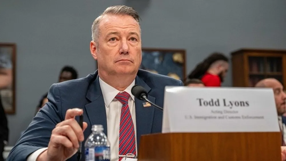 Ο Τοντ Λάιονς διορίστηκε υπηρεσιακός επικεφαλής της ICE από τον Ντόναλντ Τραμπ τον Μάρτιο του 2025. Ο διευθυντής της Υπηρεσίας Μετανάστευσης και Τελωνείων, Τοντ Λάιονς, μιλά σε συνέντευξη Τύπου για την ανακοίνωση της επετείου ενός έτους από την επανέναρξη λειτουργίας του Γραφείου Συνεργασίας με Θύματα Εγκλημάτων Μετανάστευσης (VOICE), στην Ουάσιγκτον, την Πέμπτη 9 Απριλίου 2026