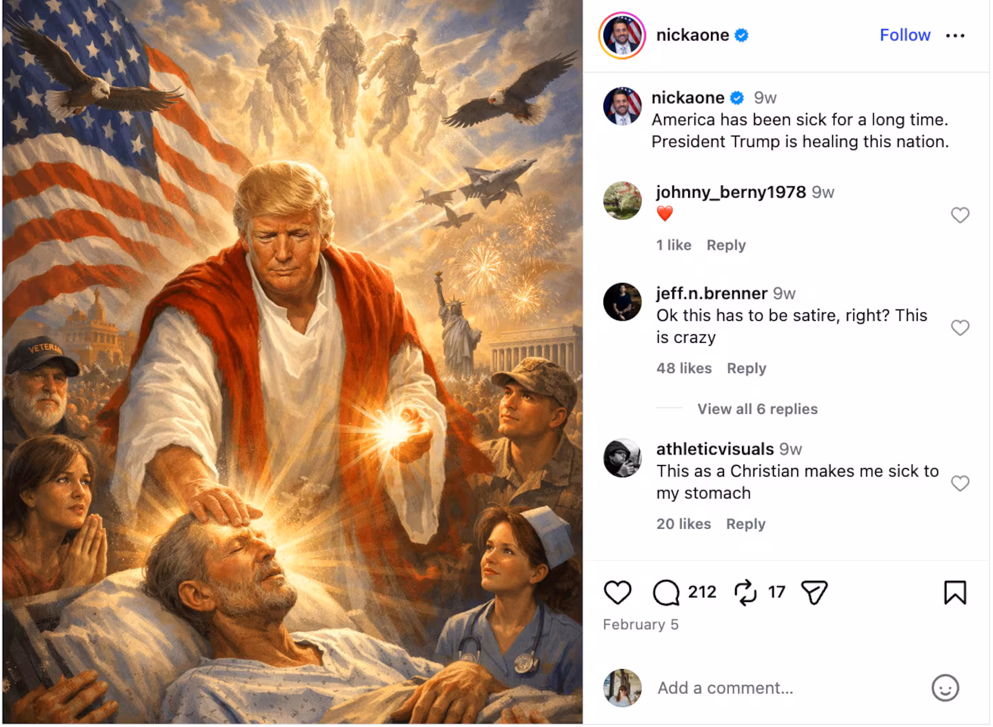 Η εικόνα του Τραμπ ως Ιησού φαίνεται να είναι εμπνευσμένη από ανάρτηση του Αυστραλοαμερικανού σχολιαστή Νικ Άνταμς στις 4 Φεβρουαρίου στο Instagram, ο οποίος αυτοαποκαλείται «αγαπημένος συγγραφέας του Προέδρου Τραμπ».
