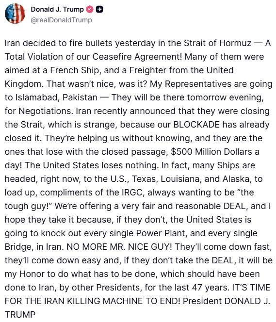 «Το Ιράν αποφάσισε χθες να ρίξει πυροβολισμούς στο Στενό του Ορμούζ — Μια πλήρης παραβίαση της συμφωνίας κατάπαυσης του πυρός που έχουμε συνάψει! Πολλοί από αυτούς στόχευαν ένα γαλλικό πλοίο και ένα φορτηγό πλοίο από το Ηνωμένο Βασίλειο. Δεν ήταν και πολύ ωραίο αυτό, έτσι; Οι εκπρόσωποί μου πηγαίνουν στο Ισλαμαμπάντ του Πακιστάν — θα βρίσκονται εκεί αύριο το βράδυ, για διαπραγματεύσεις. Το Ιράν ανακοίνωσε πρόσφατα ότι θα κλείσει το Στενό, κάτι που είναι παράξενο, επειδή ο ΑΠΟΚΛΕΙΣΜΟΣ μας το έχει ήδη κλείσει.