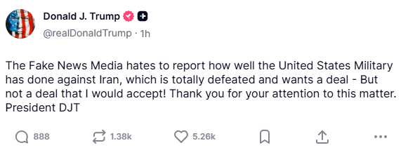 «Τα μέσα ενημέρωσης των ψευδών ειδήσεων απεχθάνονται να μεταδώσουν πόσο καλά τα έχει πάει ο αμερικανικός στρατός εναντίον του Ιράν, που είναι εντελώς ηττημένο και θέλει συμφωνία αλλά όχι συμφωνία που θα αποδεχόμουν!», ανέφερε ο κ. Τραμπ μέσω Truth Social, χωρίς περισσότερες διευκρινίσεις.