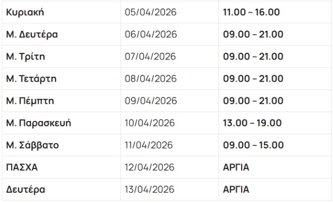 Μεγάλη Δευτέρα: 09:00 – 21:00 Μεγάλη Τρίτη: 09:00 – 21:00 Μεγάλη Τετάρτη: 09:00 – 21:00 Μεγάλη Πέμπτη: 09:00 – 21:00 Μεγάλη Παρασκευή: 13:00 – 19:00 Μεγάλο Σάββατο: 09:00 – 15:00 Κυριακή και Δευτέρα του Πάσχα: Κλειστά