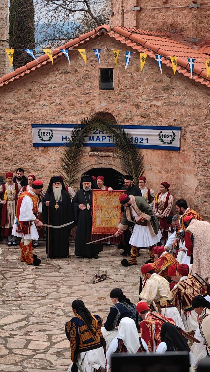 Με ιδιαίτερη λαμπρότητα και κάθε επισημότητα κορυφώθηκαν οι εκδηλώσεις για τον εορτασμό της εθνικής επετείου και του Ευαγγελισμού της Θεοτόκου στην ιστορική Ιερά Μονή Αγίας Λαύρας, παρουσία πλήθους πιστών και εκπροσώπων των αρχών. Στον ιερό χώρο που συνδέεται άρρηκτα με την έναρξη της Ελληνικής Επανάστασης του 1821 και την ευλογία του λαβάρου από τον Παλαιών Πατρών Γερμανό, τελέστηκε Πανηγυρική Πολυαρχιερατική Θεία Λειτουργία στο Καθολικό της Μονής.