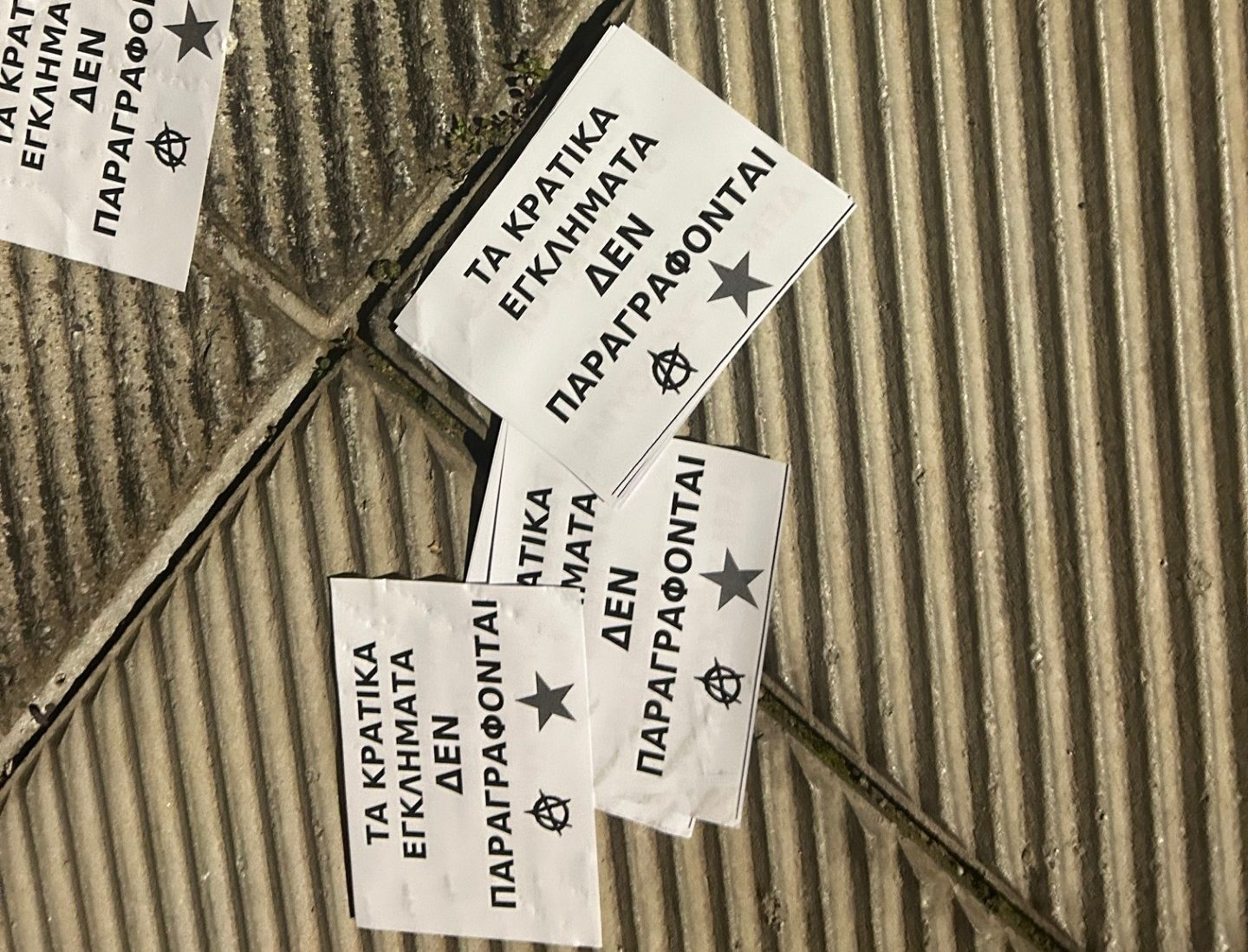 Σύμφωνα με πληροφορίες, οι δράστες πέταξαν τρικάκια που έγραφαν «τα κρατικά εγκλήματα δεν παραγράφονται» και μπογιές.