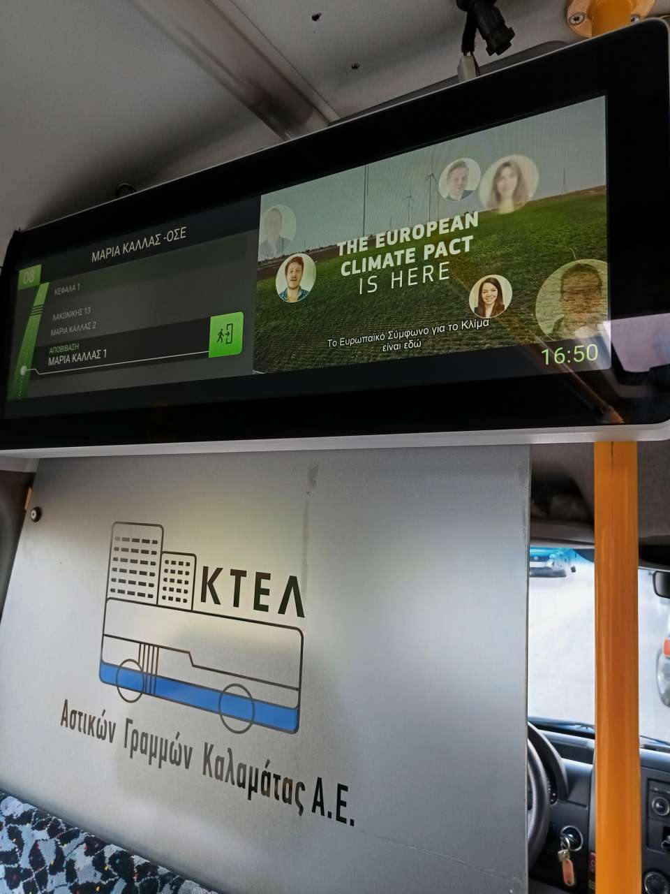 «Ίσως ακούγεται κλισέ, έχουμε μόνο έναν πλανήτη! Πρέπει να τον προστατεύσουμε, πρέπει να τον φροντίσουμε. Πρέπει να του δώσουμε αγάπη. Η κλιματική αλλαγή είναι μία από τις μεγαλύτερες απειλές που αντιμετωπίζουμε». Αυτό τονίζει μεταξύ άλλων ένα από τα μηνύματα στις ψηφιακές οθόνες ενημέρωσης που βρίσκονται στο εσωτερικό 16 λεωφορείων του αστικού ΚΤΕΛ Καλαμάτας και ξεκίνησαν να προβάλουν αυτή την εβδομάδα 6 σύντομα ενημερωτικά βίντεο για την κλιματική αλλαγή. Η προβολή των συγκεκριμένων βίντεο πραγματοποιείται με την άδεια της Ευρωπαϊκής Επιτροπής και ειδικότερα της Γενικής Διεύθυνσης Δράσης για το Κλίμα (DG CLIMA), με τη συμβολή του οργανισμού ΙΝΖΕΒ, ο οποίος αποτελεί τον Συντονιστή του Ευρωπαϊκού Συμφώνου για το Κλίμα στην Ελλάδα και έχουν ως βασική θεματολογία, την κλιματική αλλαγή και τις επιπτώσεις της, μηνύματα από παιδιά και εφήβους για την καταπολέμηση της κλιματικής αλλαγής, την επίτευξη της κλιματικής ουδετερότητας έως το 2050.