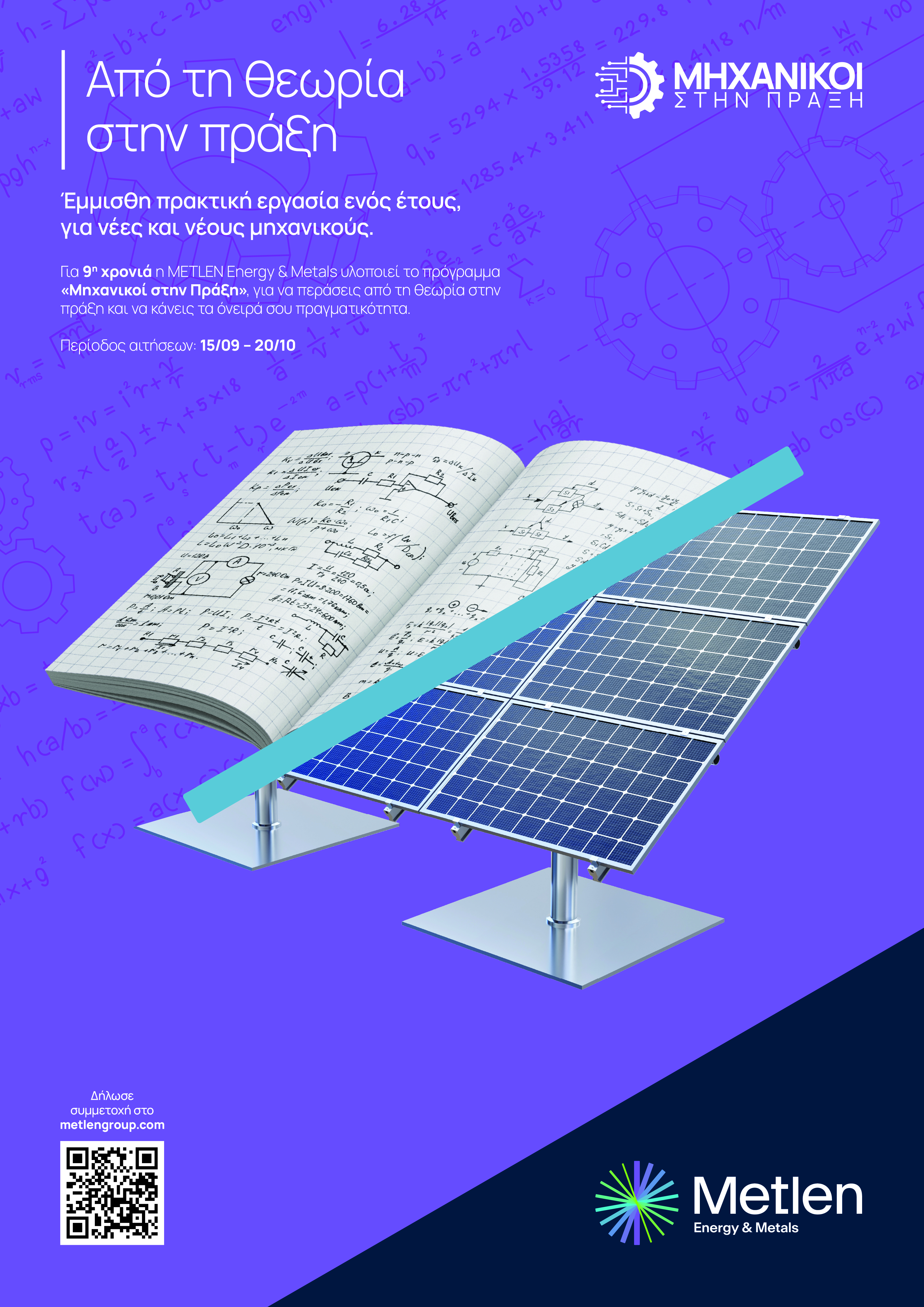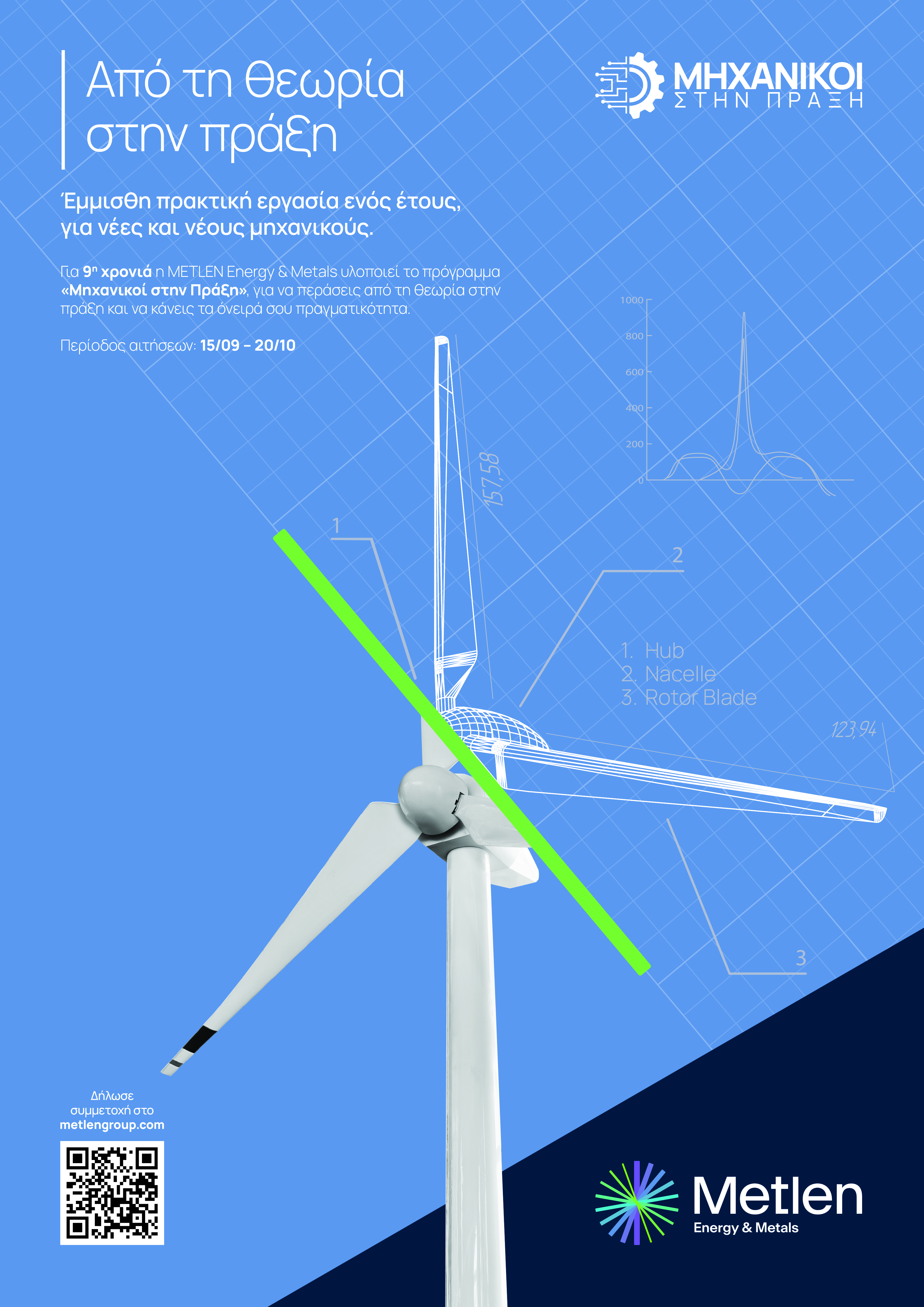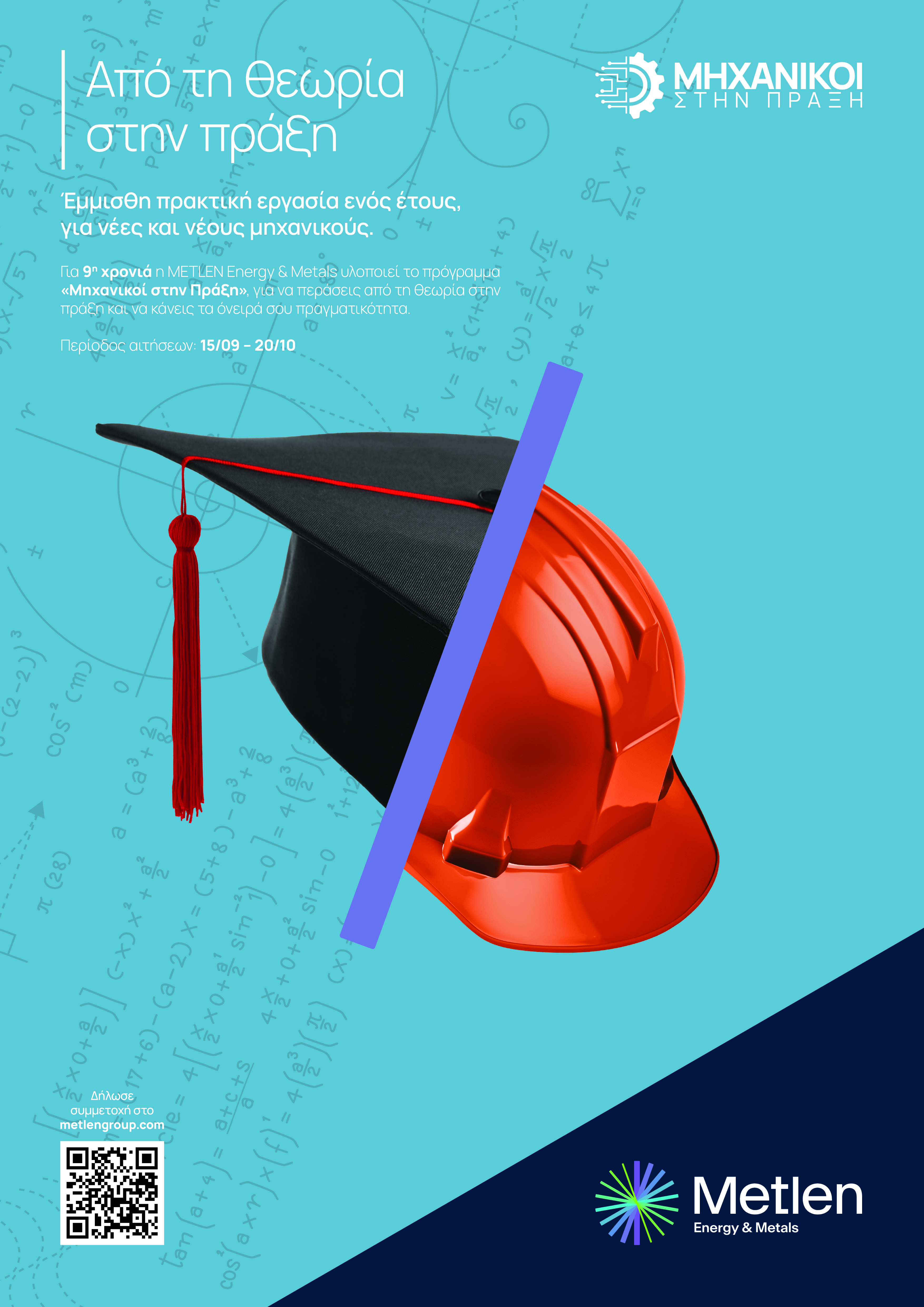 Η METLEN προσκαλεί για ακόμη μία χρονιά τις νέες και τους νέους απόφοιτους μηχανικούς να συμμετάσχουν στον 9ο κύκλο του προγράμματος “Μηχανικοί στην Πράξη”. Πρόκειται για ένα έμμισθο πρόγραμμα πρακτικής εργασίας διάρκειας ενός έτους, που λειτουργεί ως «σχολείο» υψηλού επιπέδου για μηχανικούς, δίνοντάς τους την ευκαιρία να εφαρμόσουν όσα έμαθαν στις σπουδές τους σε πραγματικές συνθήκες εργασίας. Μετά την επιτυχημένη περσινή διεύρυνση, το πρόγραμμα υλοποιείται για δεύτερη χρονιά όχι μόνο στην Ελλάδα, αλλά τόσο στην Αγγλία, όσο και στην Ιταλία, δίνοντας έτσι στους συμμετέχοντες διεθνή εμπειρία και οπτική.