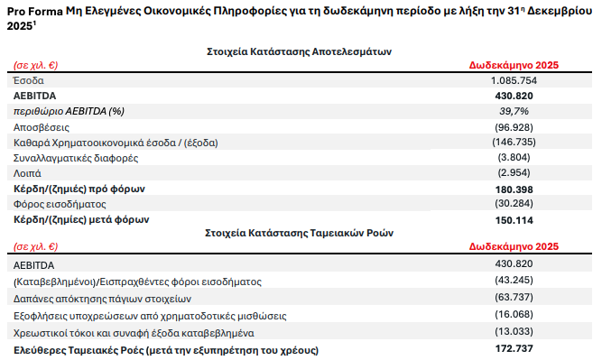 Η pro forma απόδοση του ενοποιημένου οργανισμού για τη δωδεκάμηνη περίοδο διαμορφώνεται σε έσοδα €1,086 εκατ. και AEBITDA €430,8 εκατ., που αντιστοιχεί σε περιθώριο 39,7%, εντός των προβλέψεων και των εκτιμήσεων που είχαν δοθεί.