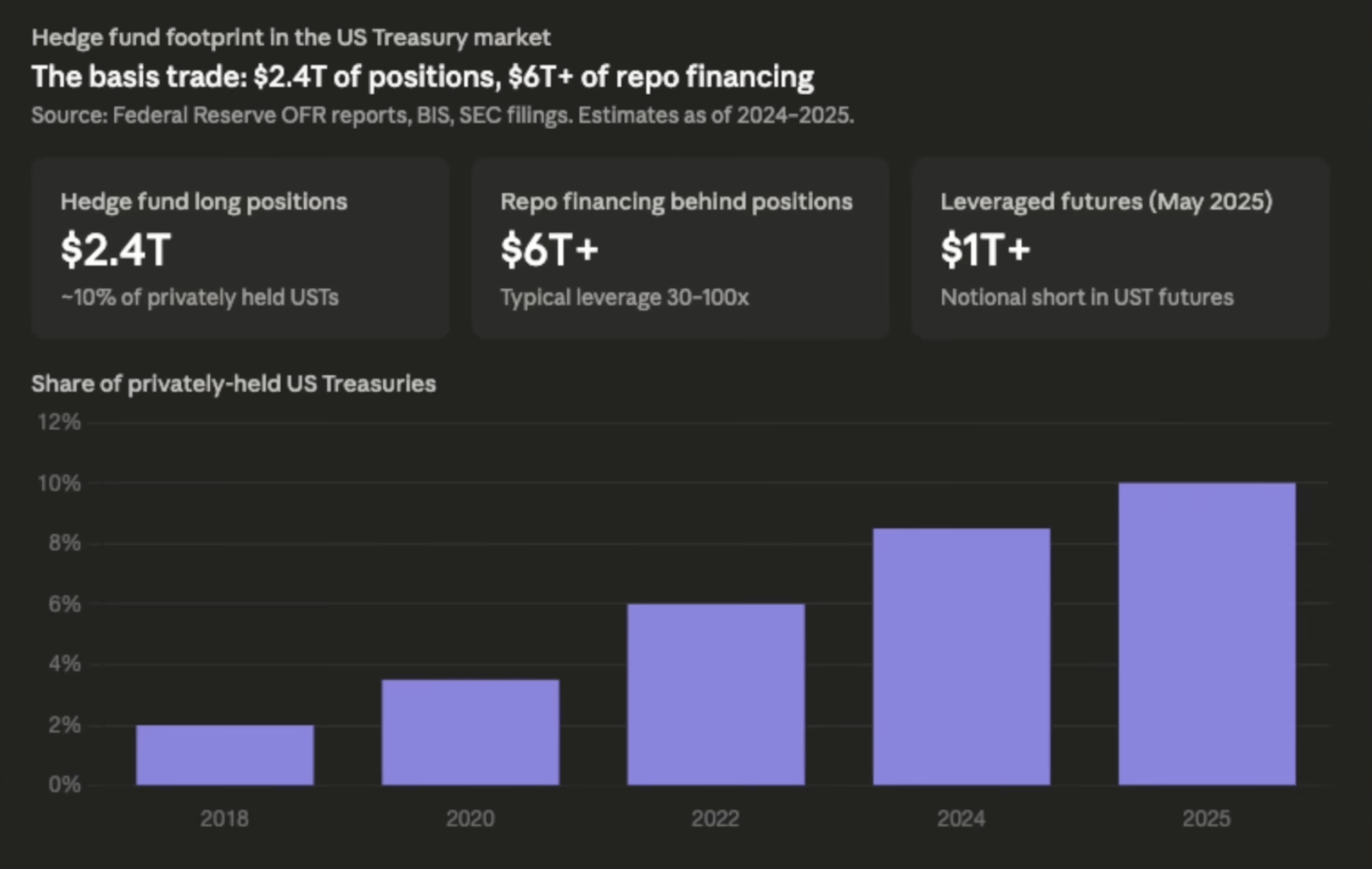 Αν το σοβαρό, μακροπρόθεσμο χρήμα φεύγει, ποιος αγοράζει; Η απάντηση προκαλεί ίλιγγο: τα αμερικανικά hedge funds με δανεικά χρήματα και τεράστια μόχλευση. Η στρατηγική ονομάζεται Treasury Basis Trade. Αγοράζουν ομόλογα και σορτάρουν συμβόλαια μελλοντικής εκπλήρωσης για να κερδίσουν ελάχιστες μονάδες βάσης, χρησιμοποιώντας μόχλευση 50 ή και 100 προς 1. Περίπου το 10% του αμερικανικού χρέους βρίσκεται πλέον στα χέρια κερδοσκόπων. Αυτή η μηχανή λειτουργεί όσο υπάρχει ηρεμία. Στο πρώτο σοκ ρευστότητας, το σύστημα θα καταρρεύσει όπως τον Μάρτιο του 2020, αναγκάζοντας τη Fed να τυπώσει τρισεκατομμύρια σε μια εβδομάδα.