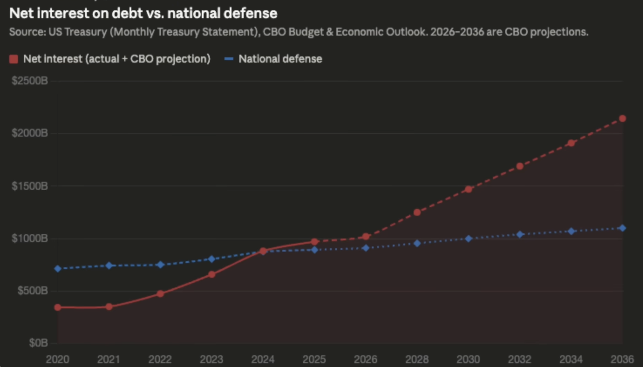 Εδώ είναι το γεωπολιτικό σοκ: Το 2025, για πρώτη φορά στην ιστορία, οι τόκοι του χρέους των ΗΠΑ ξεπέρασαν τον προϋπολογισμό για την εθνική άμυνα (893 δισ. δολάρια). Το 2026, το χρέος έφτασε το 101% του ΑΕΠ. Καθώς οι τόκοι είναι μη διακριτική δαπάνη (πρέπει να πληρωθούν πάση θυσία), η μόνη πηγή περικοπών είναι το Πεντάγωνο. Οι αναλύσεις της RAND δείχνουν ότι η διατήρηση της παγκόσμιας παρουσίας των ΗΠΑ είναι πλέον μαθηματικά αδύνατη. Η Αμερική ίσως αναγκαστεί να κλείσει βάσεις και να αποσύρει αεροπλανοφόρα, όχι επειδή έχασε έναν πόλεμο, αλλά επειδή δεν μπορεί να αναχρηματοδοτήσει το χρέος της.