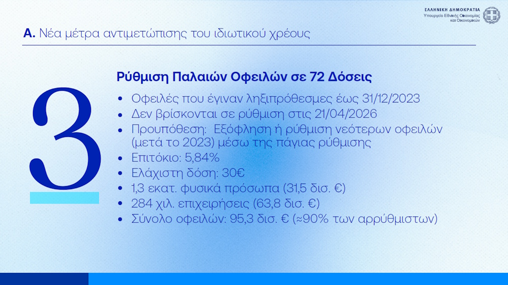 Όπως αναλύθηκε κυβέρνηση θέλει να ανοίξει μία ακόμη οδό συμμόρφωσης χωρίς να πάει σε οριζόντιες διαγραφές οφειλών, επιτρέποντας την αποπληρωμή σε περισσότερες δόσεις, κρατώντας όμως τον βασικό κανόνα ότι οι παλιές εκκρεμότητες πρέπει να μπουν σε τροχιά πληρωμής.