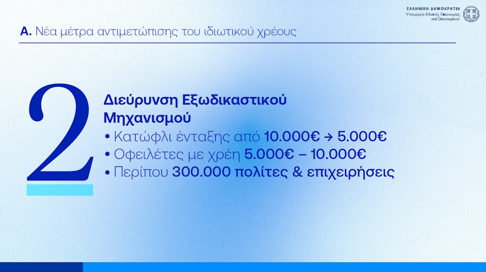 Νέα διεύρυνση του εξωδικαστικού μηχανισμού και για μικρότερα χρέη παρουσίασε σήμερα (22.4.2026) το υπουργείο Οικονομικών σε συνέχεια της ανακοίνωσης των 8 νέων κυβερνητικών μέτρων ενάντια στην κρίση, επιχειρώντας να ανοίξει την πόρτα της ρύθμισης σε οφειλέτες που μέχρι τώρα έμεναν εκτός.