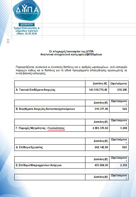 Η δημοσιοποίηση αναλυτικών στοιχείων κάθε μήνα αποτελεί μέρος της πολιτικής πλήρους διαφάνειας και λογοδοσίας προς τους πολίτες. Με συνέπεια και κοινωνική ευαισθησία, η ΔΥΠΑ συνεχίζει να υλοποιεί στοχευμένες παρεμβάσεις που στηρίζουν ουσιαστικά εργαζόμενους, ανέργους, γονείς και ευάλωτες ομάδες».