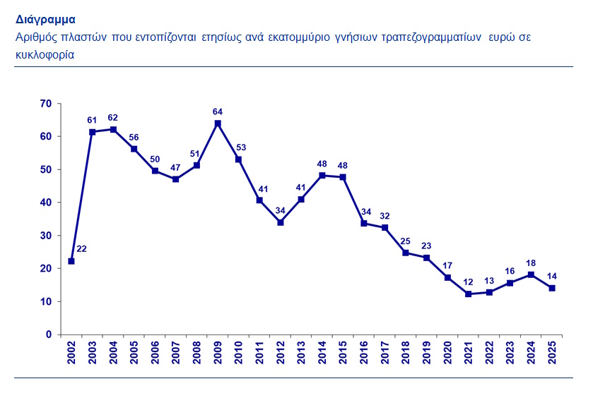 Η πιθανότητα κάποιος να λάβει πλαστό τραπεζογραμμάτιο είναι μικρή, καθώς ο αριθμός των πλαστών τραπεζογραμματίων είναι πολύ χαμηλός σε σχέση με τα γνήσια τραπεζογραμμάτια ευρώ σε κυκλοφορία, αναφέρει η ΕΚΤ. Το 2025 εντοπίστηκαν 14 πλαστά ανά εκατομμύριο γνήσιων τραπεζογραμματίων σε κυκλοφορία. Πρόκειται για ένα από τα χαμηλότερα επίπεδα από την εισαγωγή του ευρώ και μετά.