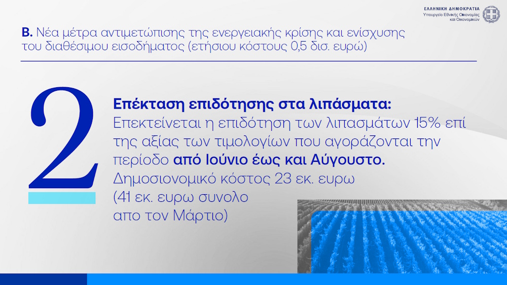 Όπως τονίστηκε σήμερα από το υπουργείο Οικονομικών, η επιστροφή 15% στα τιμολόγια λιπασμάτων ως εργαλείο άμεσης ανακούφισης παίρνει χρονική παράταση έως τον Αύγουστο, μια περίοδο που είναι κρίσιμη για την παραγωγή.