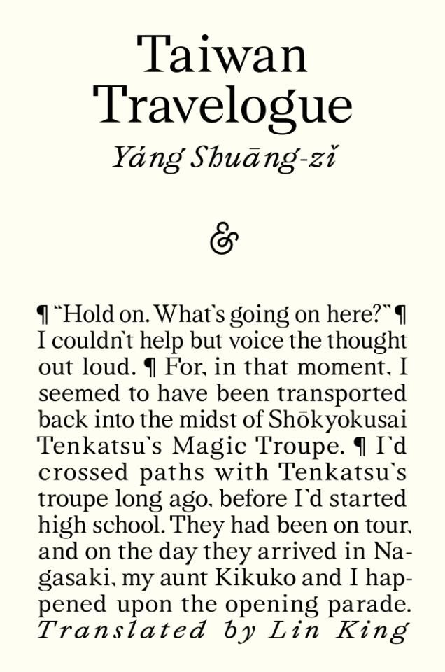 Η Yáng Shuāng-zǐ διακρίνεται με το «Taiwan Travelogue» (μετάφραση Lin King). Πρόκειται για μια γλυκόπικρη ιστορία αγάπης μεταξύ δύο γυναικών στην αποικιοκρατούμενη Ταϊβάν της δεκαετίας του 1930. Η Yáng Shuāng-zǐ επιλέγει να παρουσιάσει το έργο ως τη μετάφραση ενός χαμένου ιαπωνικού κειμένου του 1954, γραμμένου από την Αογιάμα Τσίζουκο. Μέσα από μια ανάλαφρη προσέγγιση, ξεθάβει χαμένες αποικιακές ιστορίες και αποκαλύπτει επιδέξια πώς οι σχέσεις εξουσίας επηρεάζουν ακόμη και τις πιο στενές διαπροσωπικές σχέσεις. Το βιβλίο θα κυκλοφορήσει το φθινόπωρο του 2026 στα ελληνικά με τίτλο «Ταϊβάν Ημερολόγιο ταξιδιού» (μετάφραση Δημήτρης Χατζηκωνσταντίνου, εκδόσεις Βακχικόν).