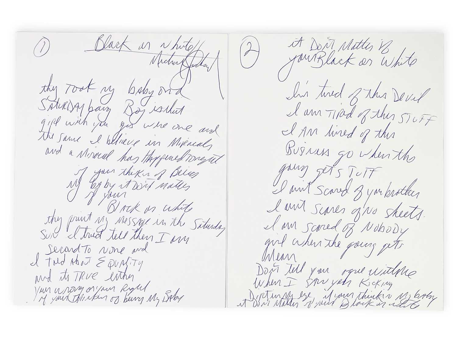 Στην ίδια επικείμενη δημοπρασία του οίκου Omega Auctions αναμένεται να παρουσιαστούν και άλλα σημαντικά αντικείμενα της μουσικής ιστορίας, όπως δύο σελίδες με χειρόγραφους στίχους του Michael Jackson για το εμβληματικό «Black or White». Οι εν λόγω σελίδες είχαν αρχικά πωληθεί από τον οίκο Julien’s το 2006 από τη συλλογή του David Gest και επανέρχονται τώρα στην αγορά με εκτιμώμενη αξία από 20.000 έως 30.000 λίρες, επιβεβαιώνοντας τη διαχρονική ζήτηση για αυθεντικά τεκμήρια της ποπ ιστορίας.