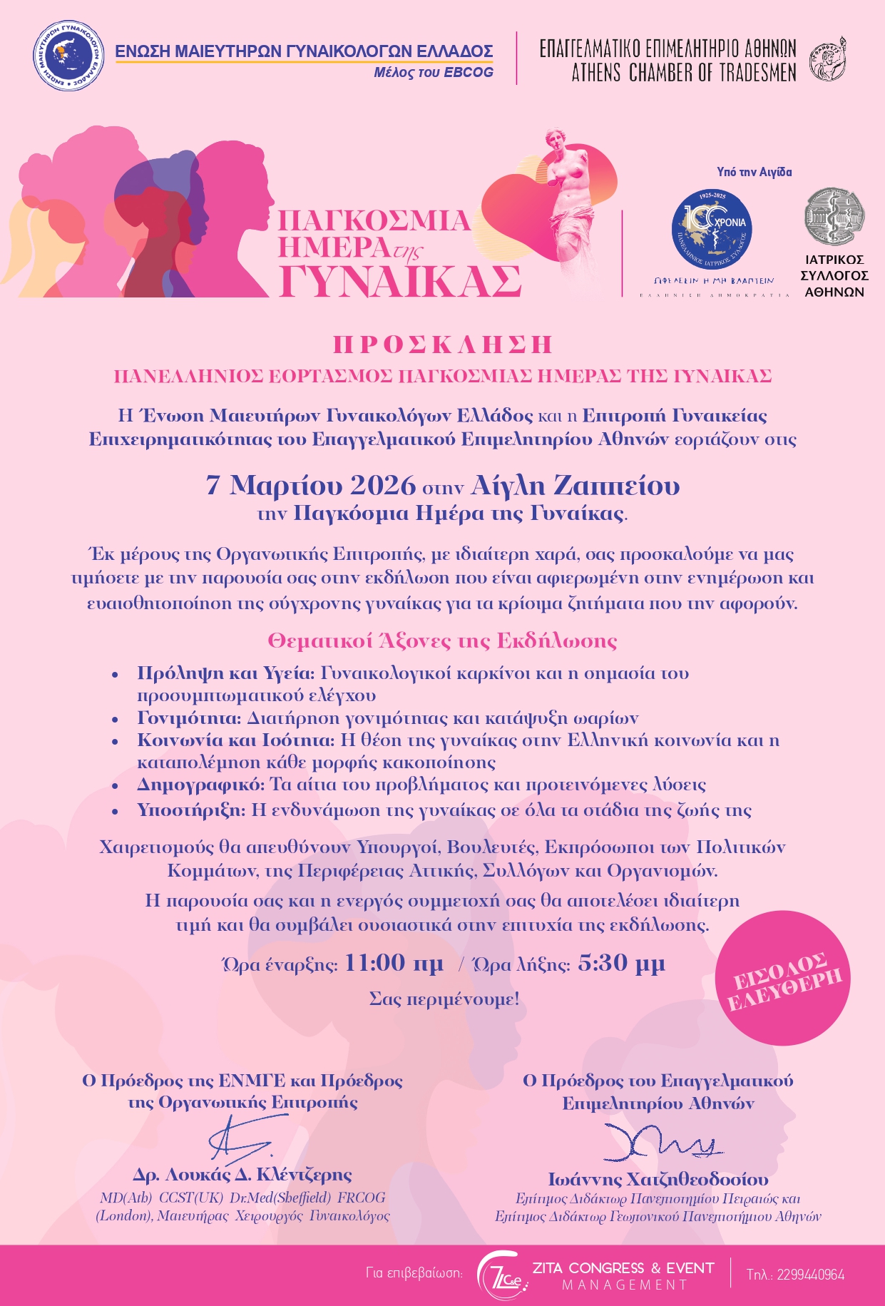 Με μια εκδήλωση αφιερωμένη στην ενημέρωση και ενδυνάμωση της σύγχρονης γυναίκας, το Επαγγελματικό Επιμελητήριο Αθηνών, η Επιτροπή Γυναικείας Επιχειρηματικότητας του Ε.Ε.Α. και η Ένωση Μαιευτήρων Γυναικολόγων Ελλάδος, γιορτάζουν στις 7 Μαρτίου 2026 στην Αίγλη Ζαππείου την Παγκόσμια Ημέρα της Γυναίκας.
